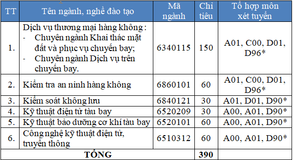 TĐT: Tổng điểm các môn trong tổ hợp =Điểm môn 1+Điểm môn 2+ Điểm môn 3; Riêng ngành Kiểm soát không lưu điểm Tiếng Anh nhân hệ số 2. (được làm tròn đến 0,25)